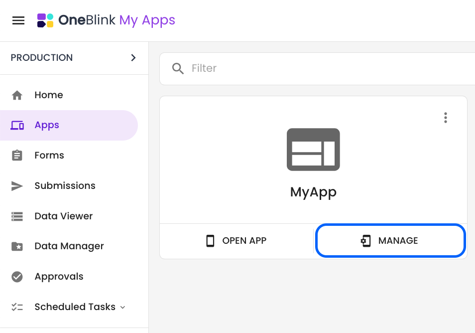 2. Click the Manage button on the app you want to add the user to.