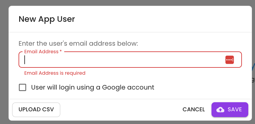 App Users are also able to authenticate using Google. When adding a new user make sure to select the login with Google option. This will ensure the app user is not sent a temporary password and the user will be able to login with Google.