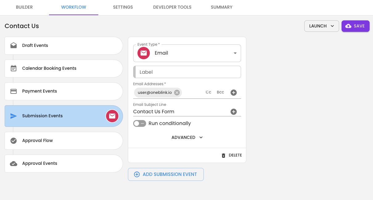 Now let's add an Email submission event, so we can see the form working. To add a submission event, click the Workflow tab. Click the Add Submission Event button, select the Email workflow and add an email address and Email Subject Line. Click save - we will now receive an email with a copy of the form and the inputs when the form is submitted.