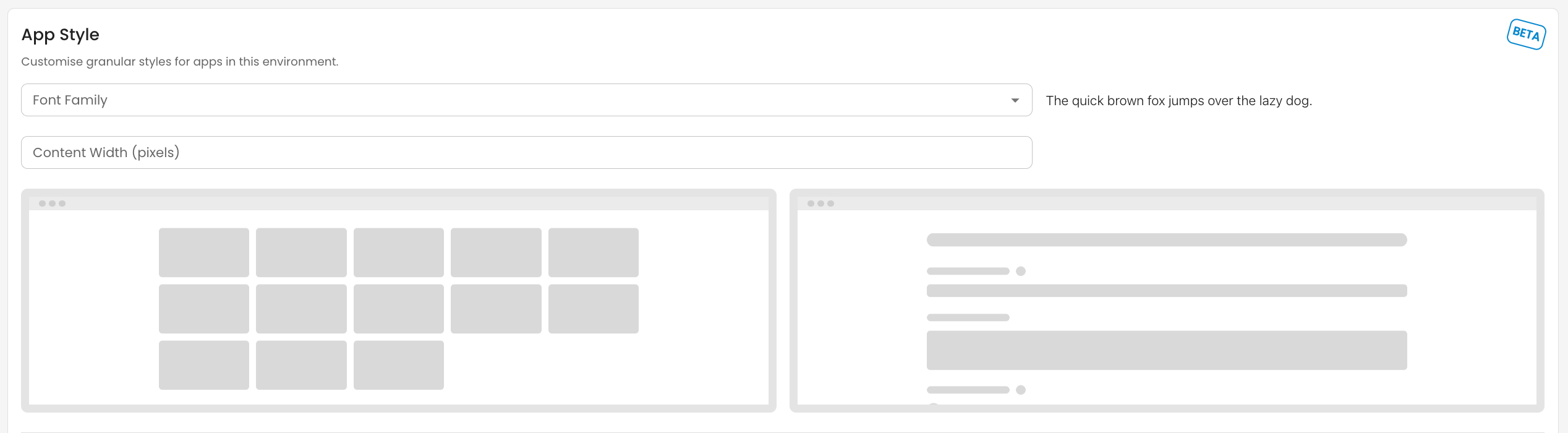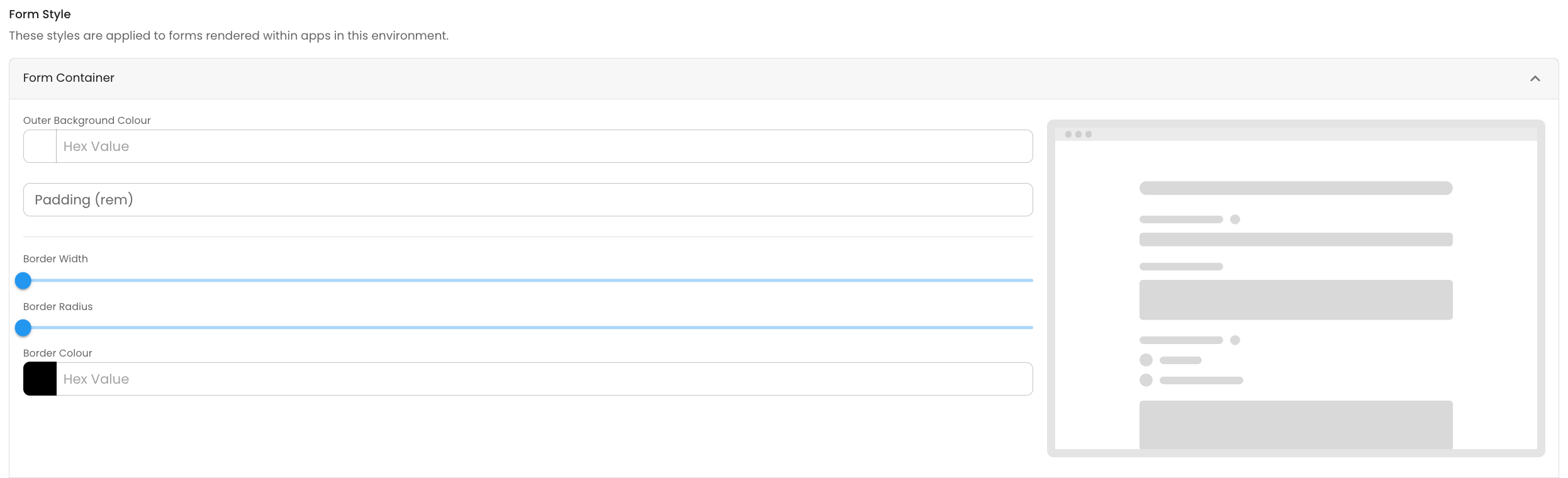Additional configurations that allow for changes to fonts, content dimensions and colours that apply to all forms in an environment, including forms associated with an app.