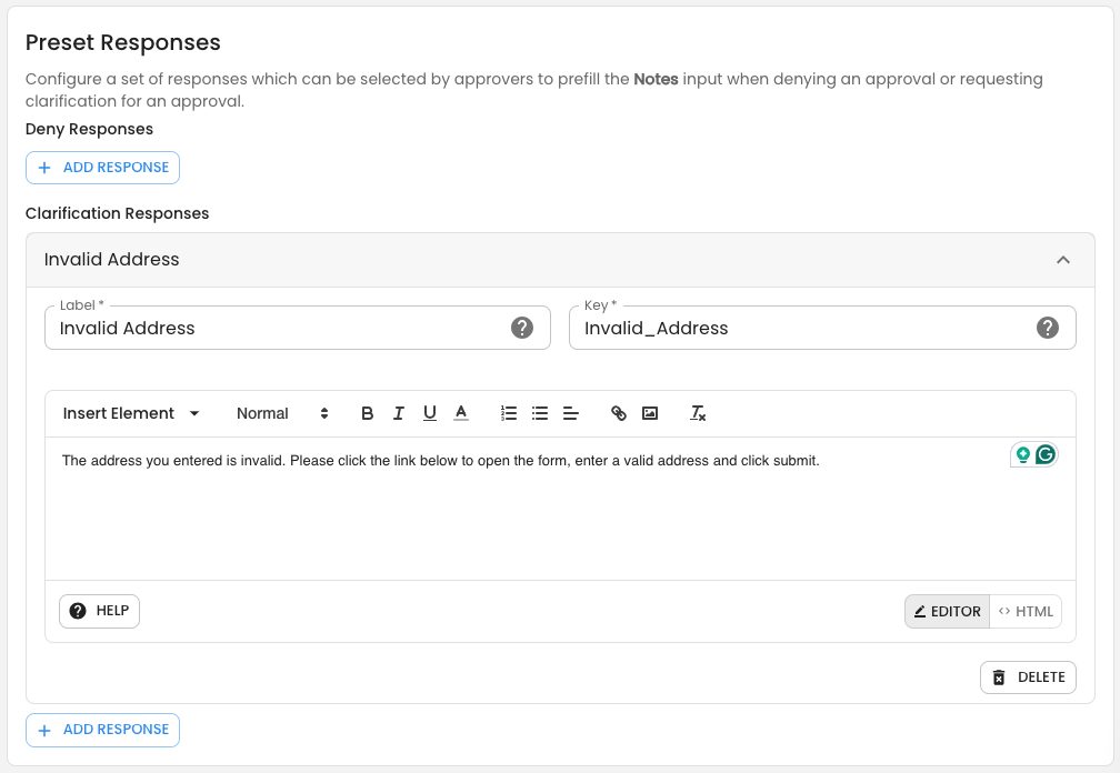 To make responding to approvals easier, use a preset response. Preset responses allow you to create a set of responses that can be easily added to your approval actions. Create a set of Deny and Clarification responses that can be used to pre-fill the notification notes for your approval actions.