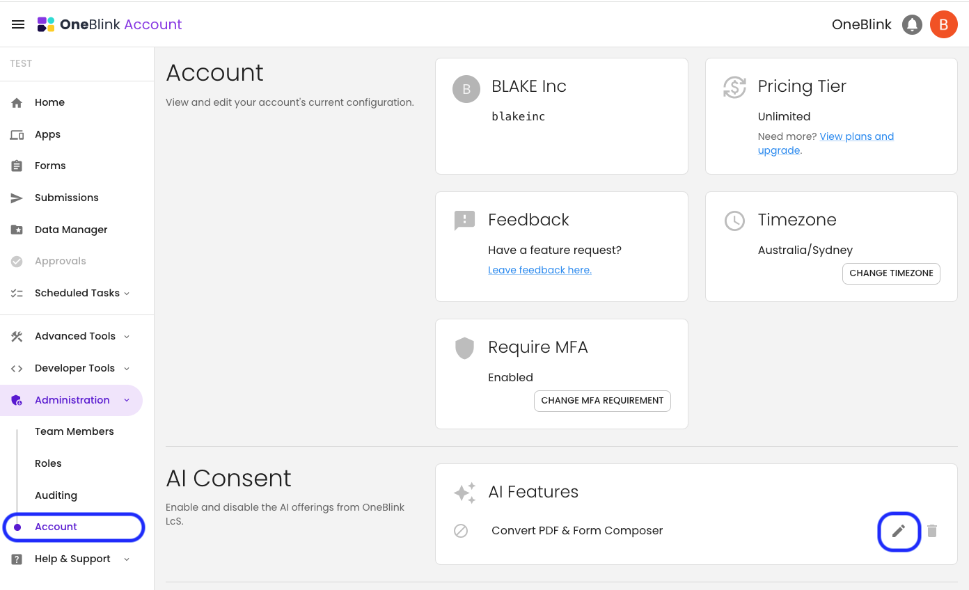 To start using Form Composer in your account, you will need an Account Owner or a Team Member with the Roles: Manager permission to navigate to the Account screen to complete the AI Concent.