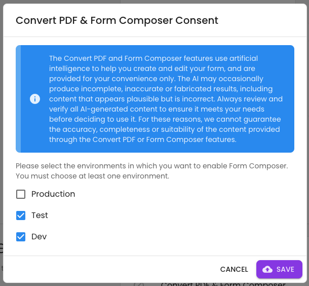Specify which environments you want to enable Form Composer, and click 'Save'.