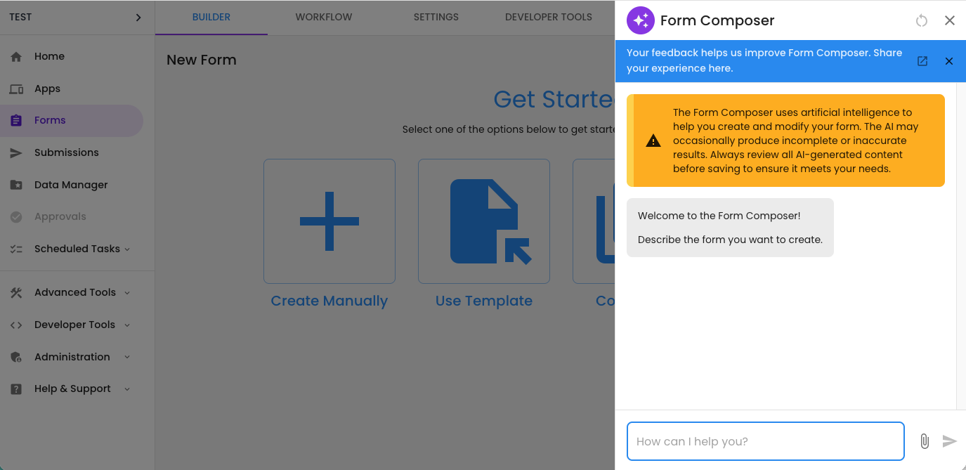 Form Composer is an AI-powered feature that allows you to build and modify forms using text prompts and file uploads. Form Composer allows you to quickly and easily build simple or complicated forms and make large-scale changes to your form.