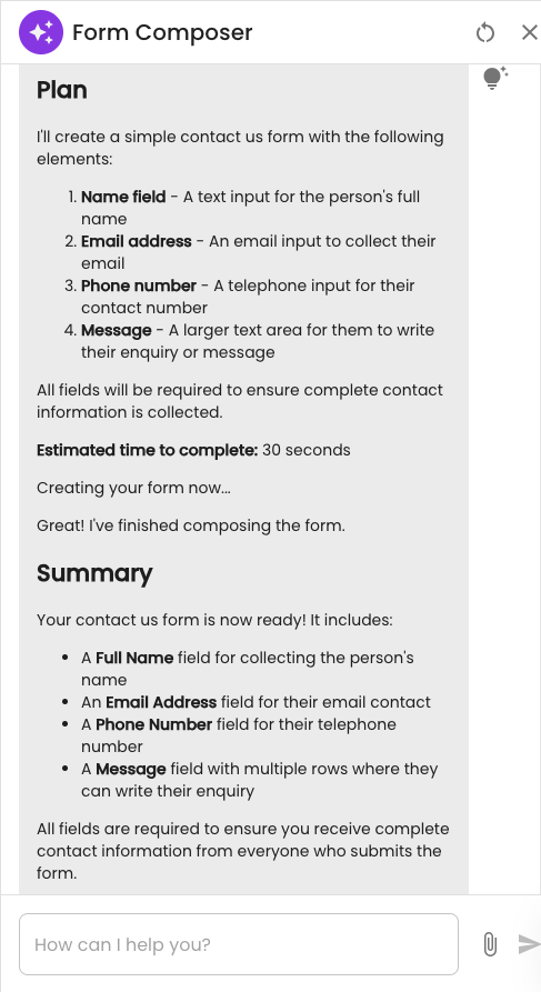 1. Reasoning: Form Composer will say, "Let me think..." You can see the reasoning by clicking the lightbulb icon.